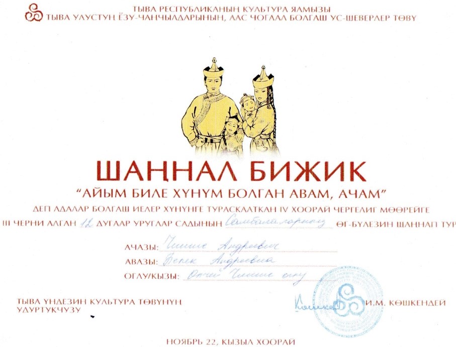 С целью сохранения и популяризации тувинской национальной культуры, развития творческого потенциала у семей, воспитания интереса и уважения к наследию предков, традиционной культуре 22 ноября состоялся городской конкурс «Айым биле хунум болган авам, ачам!», посвященного ко дню Матерей и Отцов.