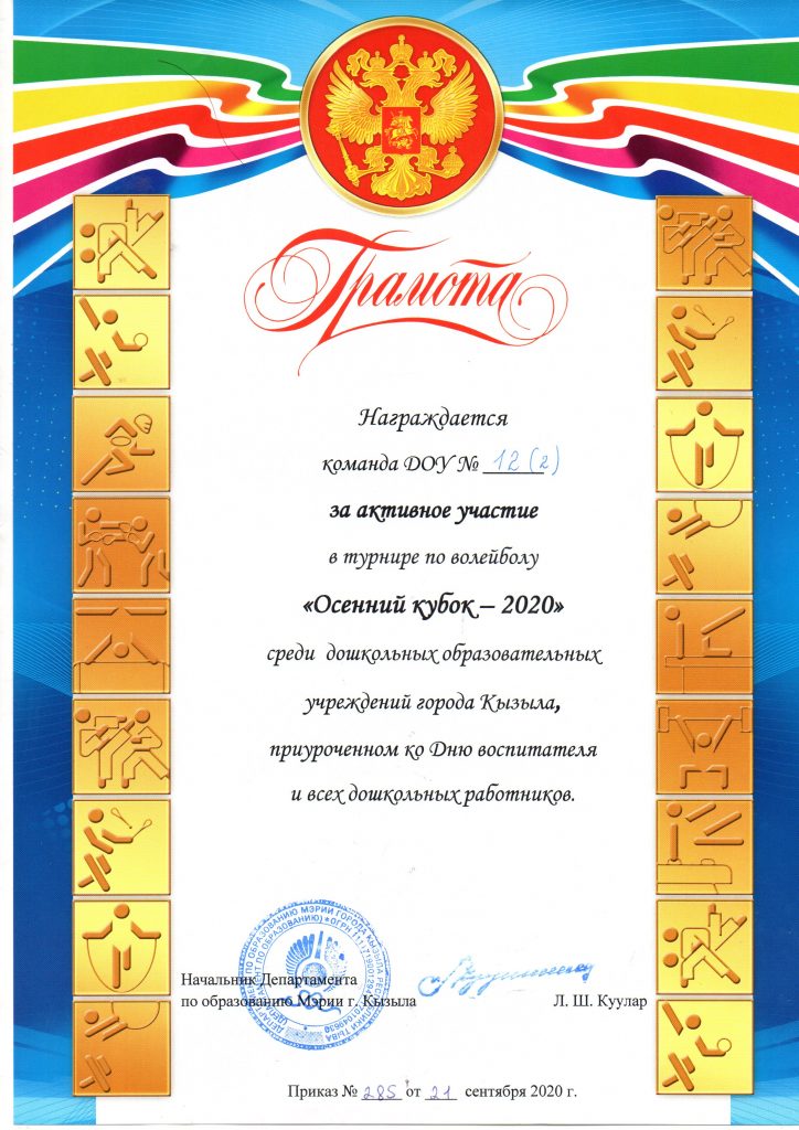 Детский сад «Кежик» принял участие в соревнованиях по волейболу среди молодых педагогов детских садов, которые состоялись 23 ноября 2019 г. в спортивном зале МБОУ «Лицей №15 г.Кызыла». Мероприятие проведено впервые в рамках плана форума молодых педагогов детских садов г.Кызыла. В соревнованиях приняли участие 128 участников из 18 детских садов города.