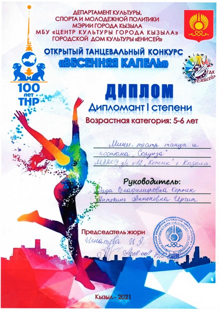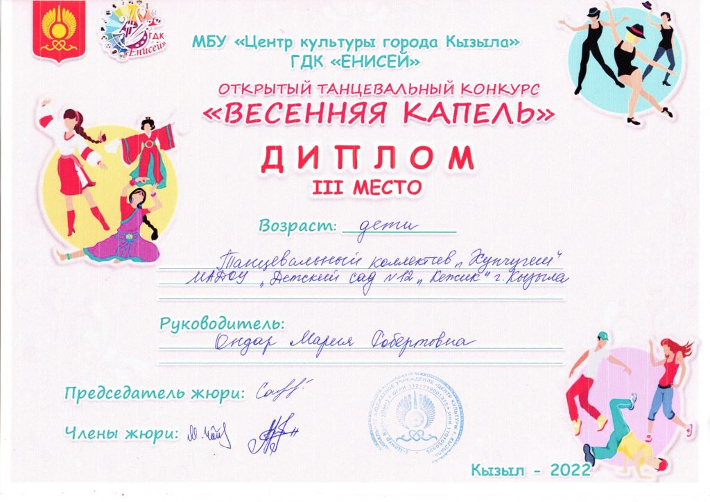 Среди подготовительных к школе групп первое почетное место занял Байыр Чойган, второе место Манчик Алдар, Хавакчык Лера, третье место заняли Куулар Даниил, Хомушку Байыр, воспитатели Кужугет Урана Салчаковна, Нанзат Алдынай Алимовна, Хертек Чинчи Откек-ооловна, Донгак Чимис Артуровна,