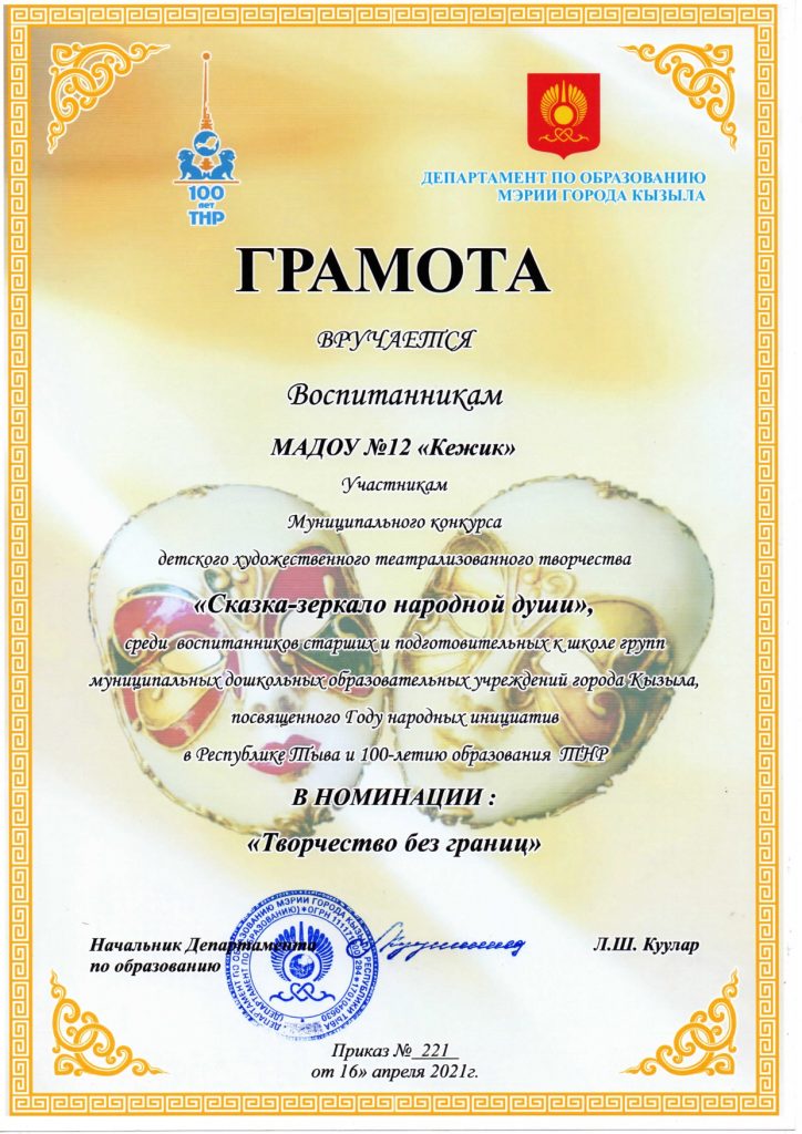 Среди детей старшей группы лучшим признаны Маады Аюр, Буянхоо Дарый, воспитатели Хертек Олча Адыг-ооловна, Салчак Аяна Валерьевна. Второе место заняла Аранчын Цэлия, воспитатели Седен Долаана Аракчааевна, Чапчын Аржаана Александровна, третье место заняли Биликти Дечен, подготовила Хертек Олча Адыг-ооловна, Самдан Ай-Демир, воспитатели Седен Долаана Аракчааевна, Чапчын Аржаана Александровна.