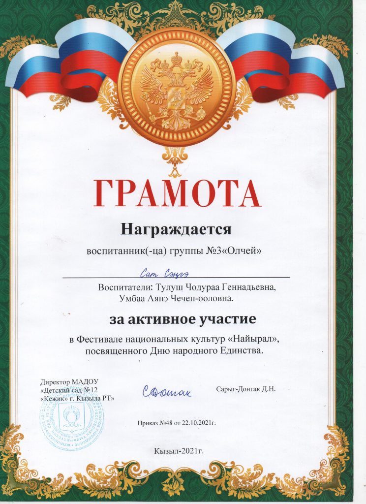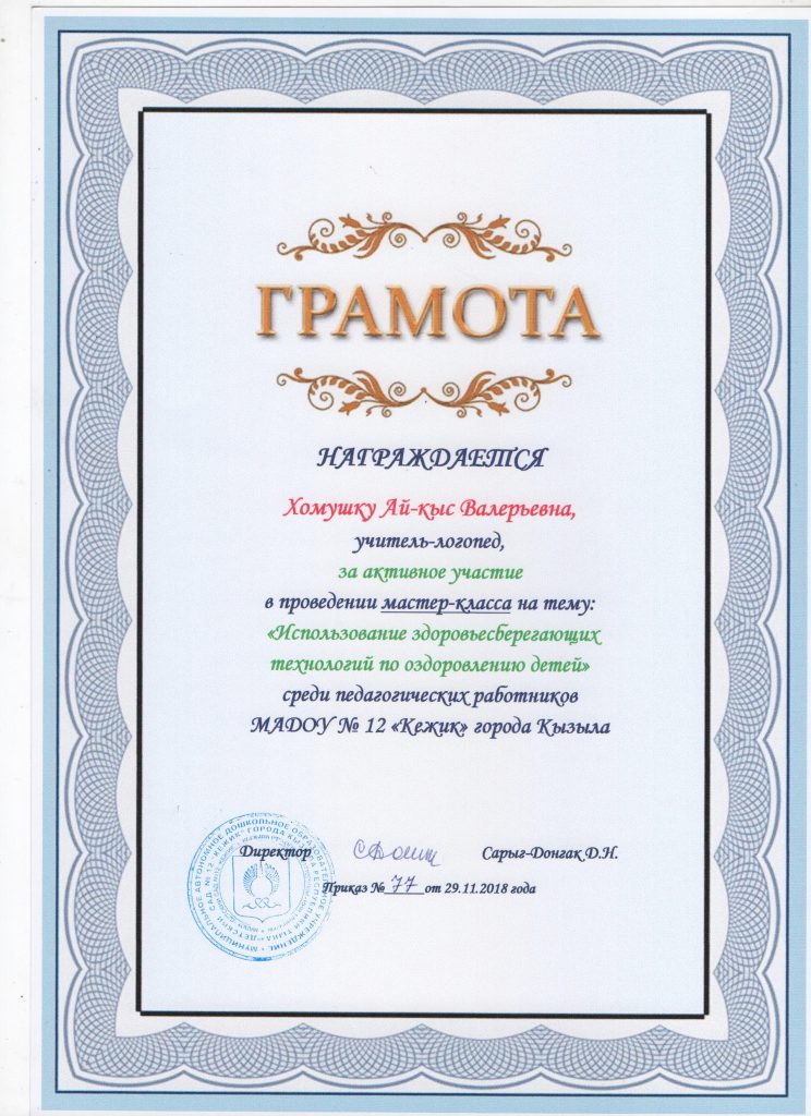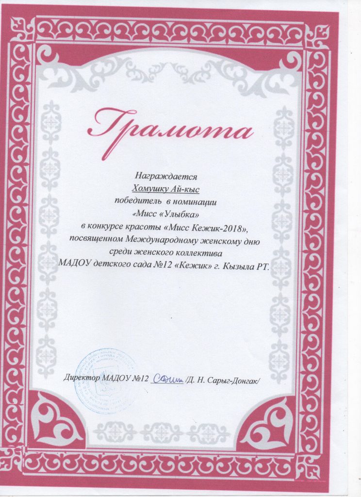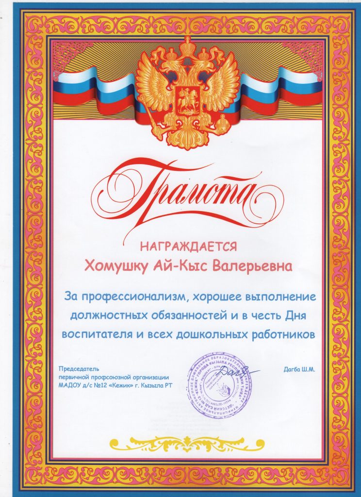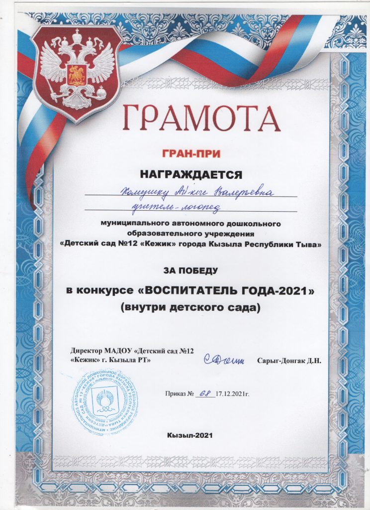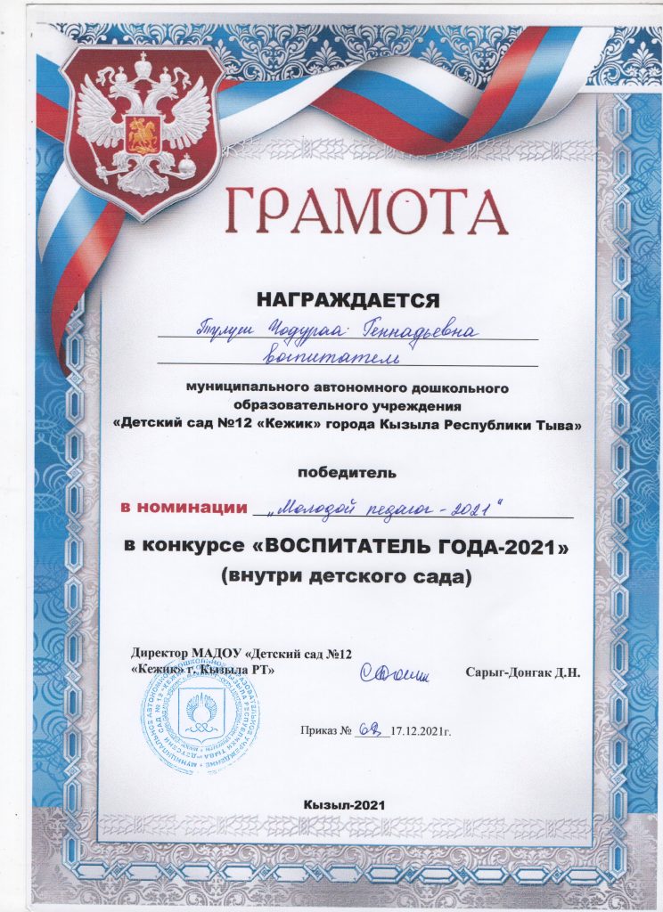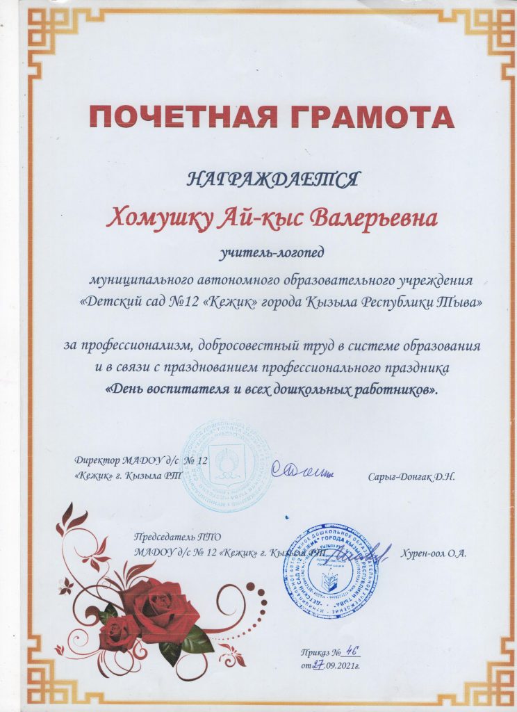 Поощрения: Почетная грамота Департамента по образованию Мэрии г. Кызыла Республики Тыва, 2020г.