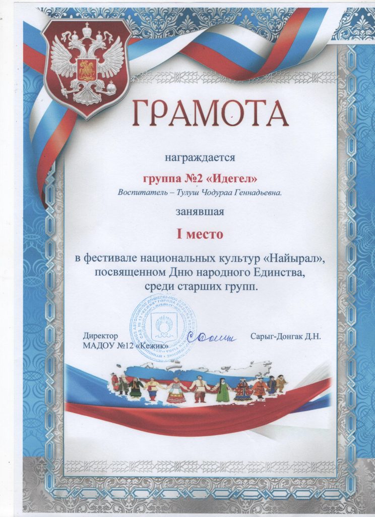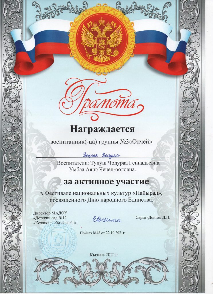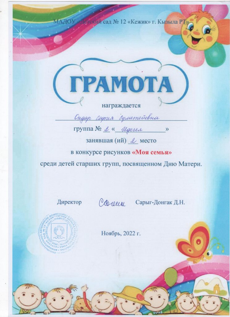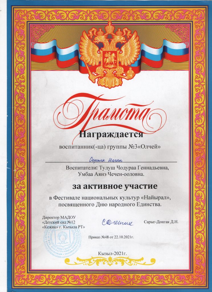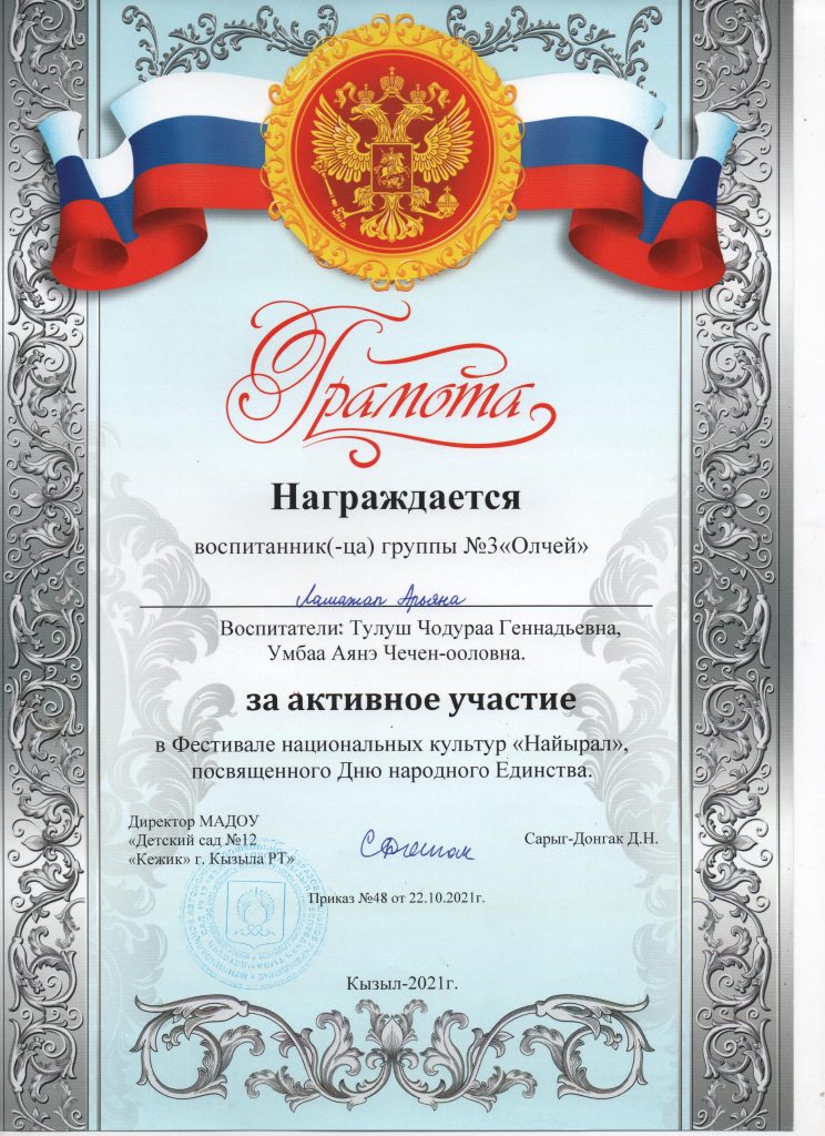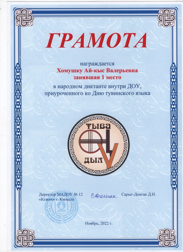 Поощрения: Почетная грамота Департамента по образованию Мэрии г. Кызыла Республики Тыва, 2020г.