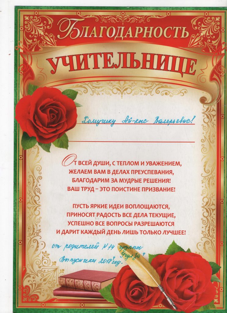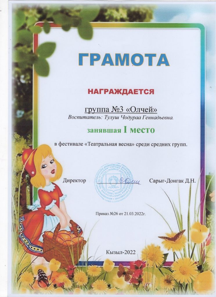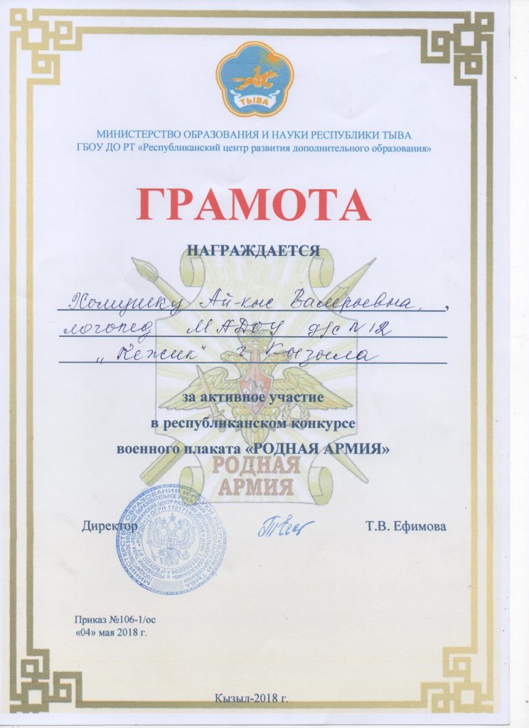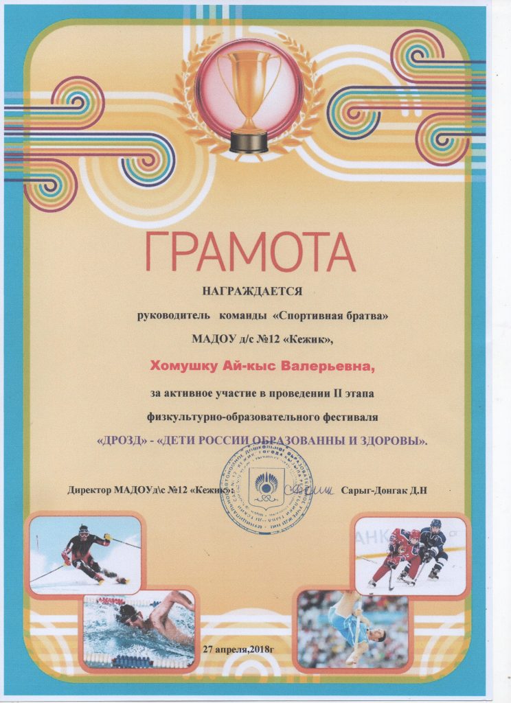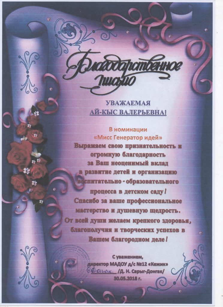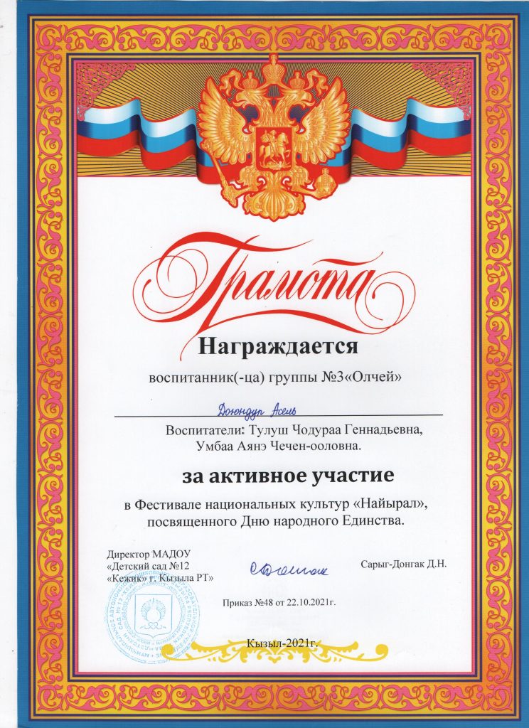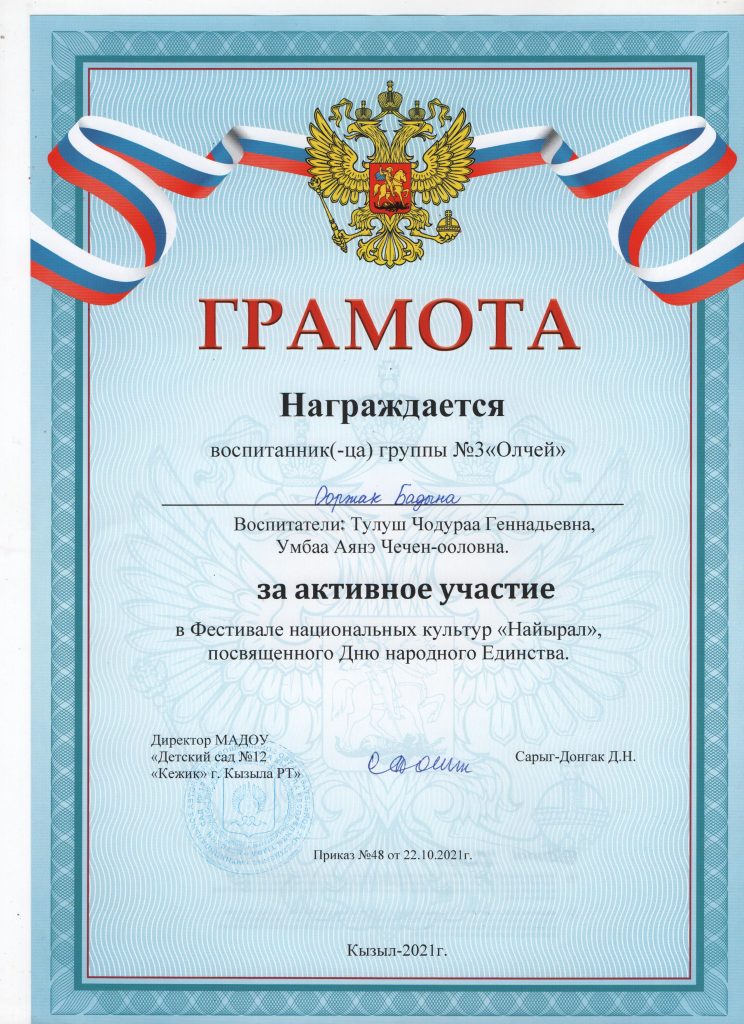 Поощрения: Почетная грамота Департамента по образованию Мэрии г. Кызыла Республики Тыва, 2020г.