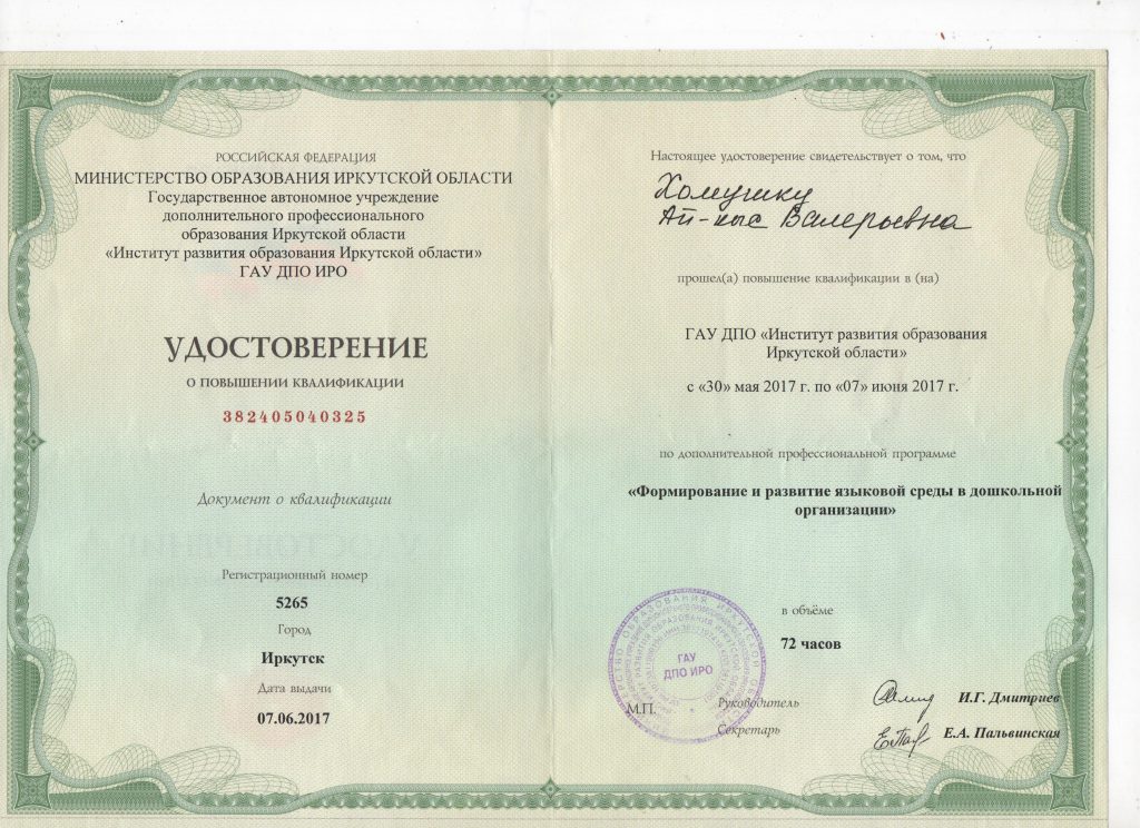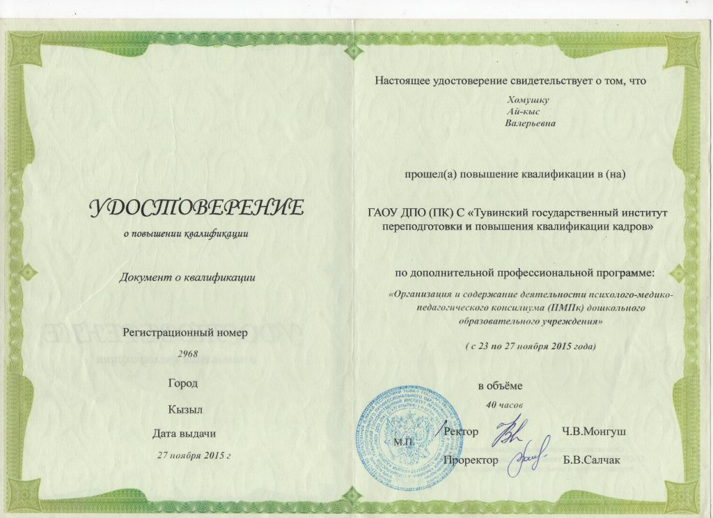 Образование: ФГБОУ ВПО «Тывинский государственный университет г. Кызыла», 2015г.