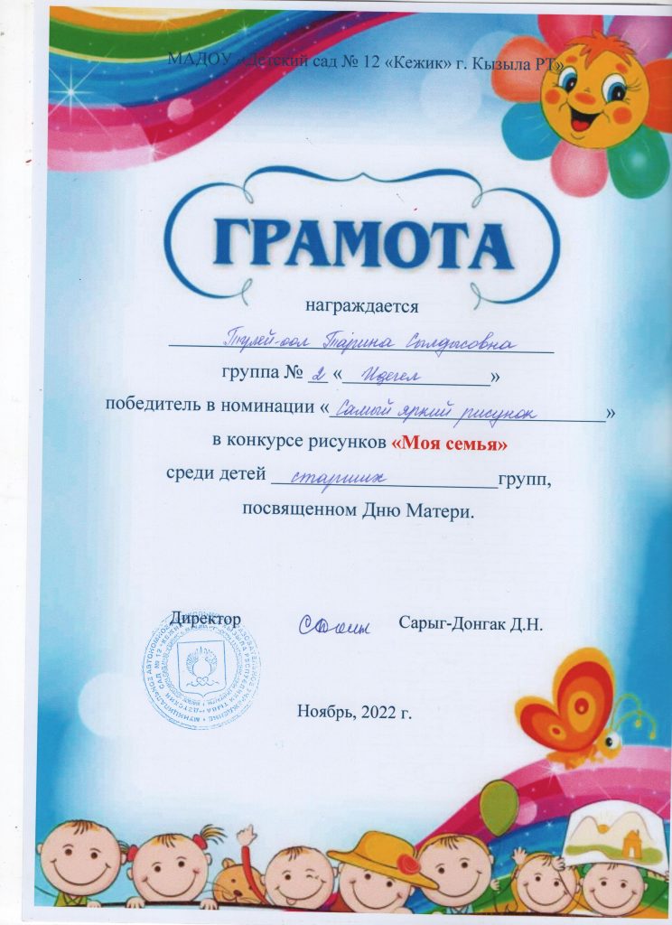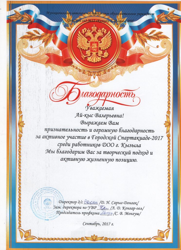 Место работы: Муниципальное автономное дошкольное образовательное учреждение «Детский сад №12 «Кежик» города Кызыла Республики Тыва»