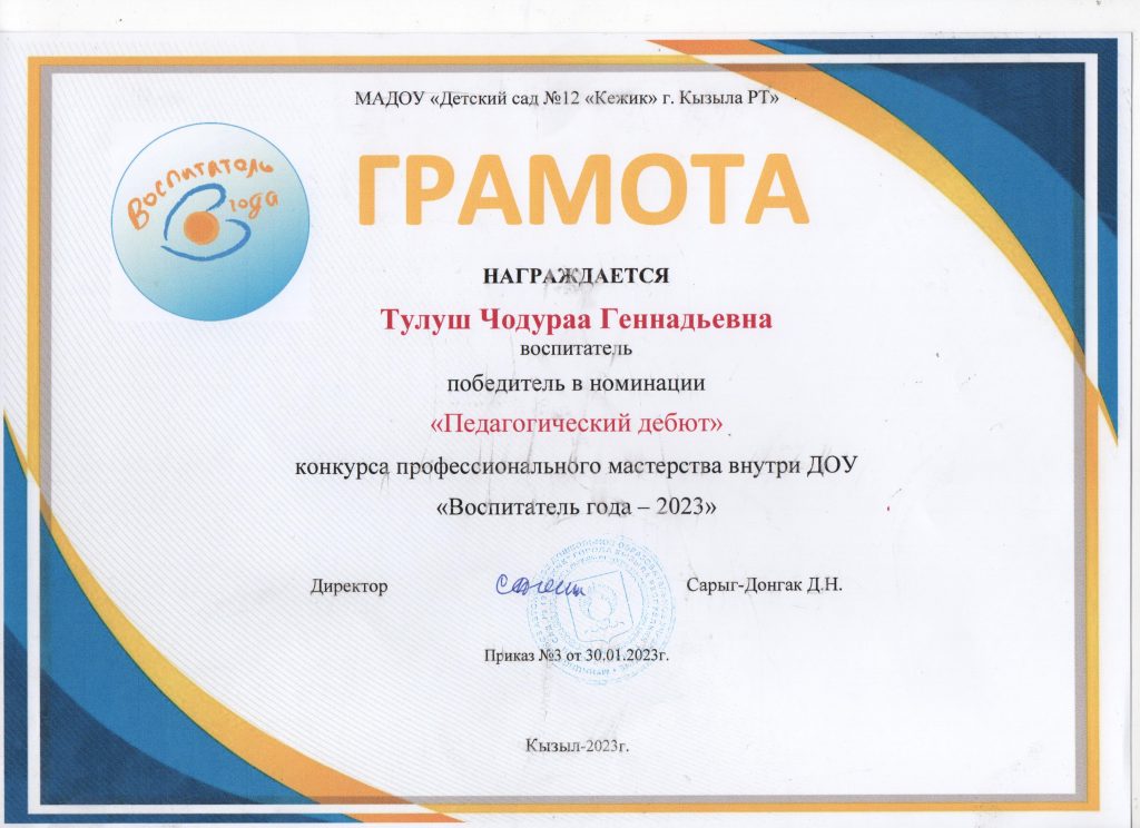 Тулуш Чодураа Геннадьевна, воспитатель, победитель внутрисадовского этапа Всероссийского конкурса профессионального мастерства»Воспитатель года — 2023″ в номинации «Педагогический дебют»